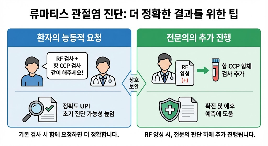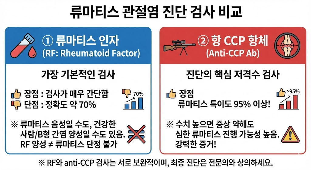 - 기본검사인 류마티스 인자 RF검사를 진행하실 때 정확한 검사결과를 알고자 하신다면, 항 CCP항체 검사도 같이 해달라고 하시면 더 정확한 진단을 받을 수 있습니다.(RF에서 양성이 나올경우 전문의 진단하에 항CCP항체 검사도 추가 진행하실 수 있습니다.)