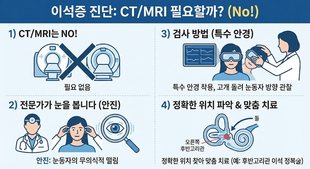 - 검사 방법 : 특수 안경을 쓰고 고개를 이리저리 돌려보며, 눈동자가 튀는 방향을 보고 "아, 오른쪽 뒷바퀴(후반고리관)에 돌이 들어갔구나!"라고 정확한 위치를 찾아냅니다.
