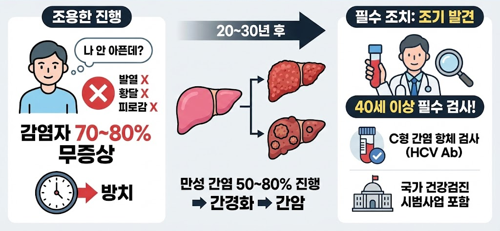C형 간염의 가장 큰 특징은 "무증상"입니다, 감염되어도 70~80%는 아무런 증상을 못 느낍니다, 그러다 보니 "나 안 아픈데?" 하고 방치하게 되고, 결국 50~80%가 만성 간염으로 진행되기도 하죠.