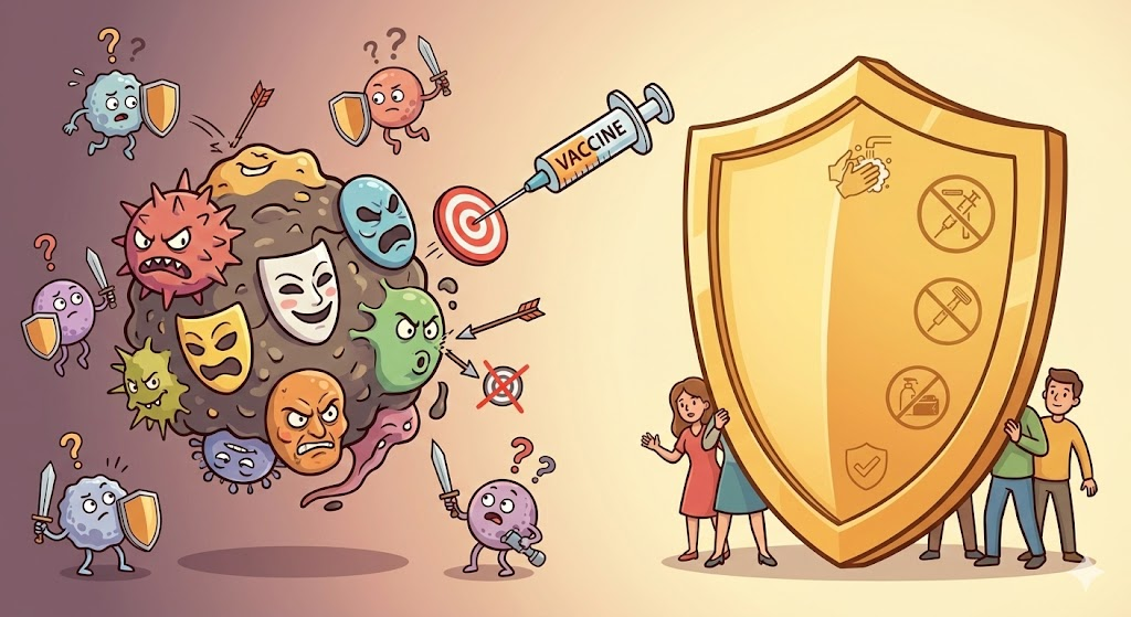 C형 간염 바이러스(HCV)는 변신의 귀재입니다, 우리 몸의 면역세포가 "아, 저렇게 생긴 놈이구나!"하고 공격하려 하면, 순식간에 유전자를 바꿔버립니다, 백신을 만들려면 고정된 타깃이 있어야 하는데, 타깃이 계속 바뀌니 백신 개발이 너무 어려운 거죠, 마치 매번 변이 하는 독감보다 더 심한 놈입니다, 그래서 C형 간염은 "예방"이 최선입니다, 걸리기 전에 조심하는 수밖에 없습니다.